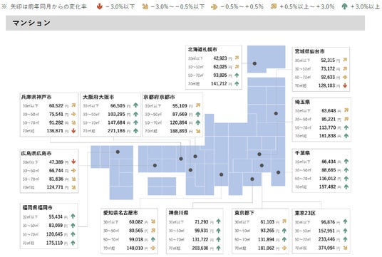 ●マンションは、カップル向きが神戸市・広島市を除く11エリアで前年同月を上回る。中でも、首都圏5エリア(東京23区・東京都下・神奈川県・埼玉県・千葉県)および札幌市・京都市・大阪市・福岡市の9エリアで2015年1月以降最高値を更新。東京23区の最高値更新は26カ月連続に。
