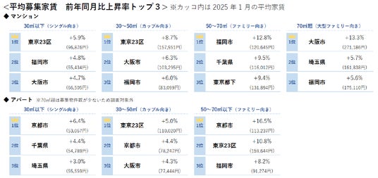 <2025年1月 全国主要都市における賃貸マンション・アパートの平均家賃(面積帯別)>