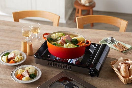 カセットガスが燃料のホットプレート。毎日の家庭料理やホームパーティー、アウトドアなどで長年親しまれてきた商品です。大判サイズで、プレートを外せばカセットこんろとしても使用できます。