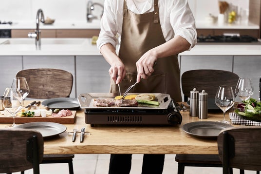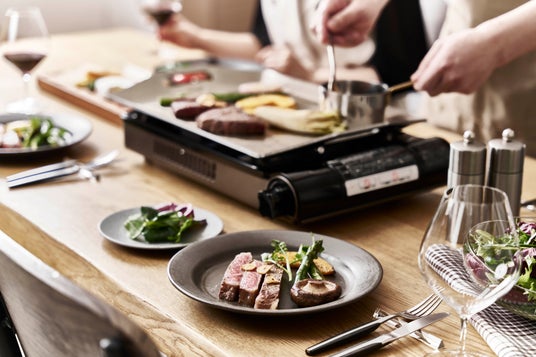 表面がステンレスのため、ナイフやヘラなど金属製の調理器具が使用可能です。調理した食材をプレートの上で切って、熱々を食べてもらう、といった本格的な鉄板焼シェフの体験をどなたでも楽しめます。ご家族やご友人のおもてなしにぴったりです。