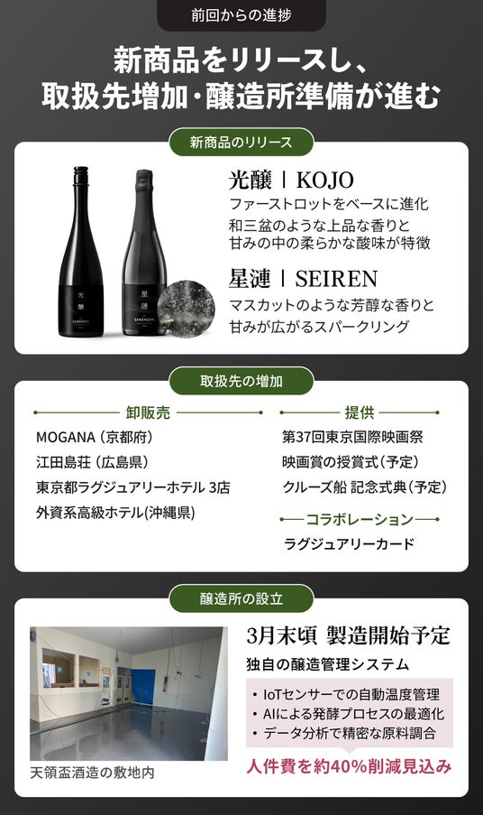 前回からの進捗として、2024年にはフラッグシップモデル「光醸」とスパークリング日本酒「星漣」をリリース。どちらもシンガポール酒チャレンジ2024で金賞を獲得し、国際的な評価を得ています。
