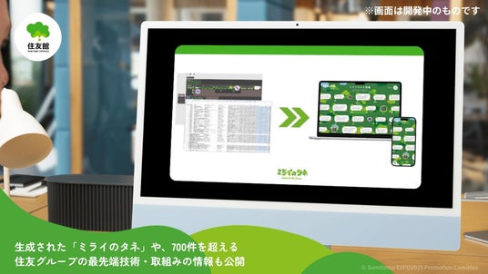 住友館 館内では、住友グループ各社それぞれの最先端技術や取組みの紹介や実物展示などに加え、それぞれから創出されたアイデア「ミライのタネ」が、開催期間を通じて、およそ700点以上展示されます。