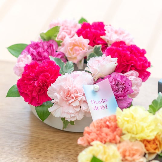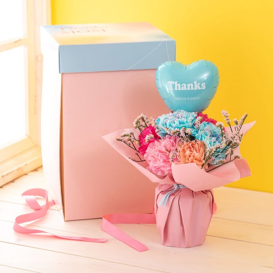 2025年母の日限定の「Thanks MOM」のメッセージが付いたサプライズボックスに入った、そのまま飾れるブーケです。ピンクのリボンをほどき上蓋を取ると、ボックスの四方がふんわり開き、ブーケが出てきます。ブーケに入った、母の日のシンボルである色とりどりのカーネーションと、Thanksのメッセージ入りハートバルーンがお母さんの笑顔を咲かせます。お手入れが簡単なスタンディングタイプのブーケなので、アレンジメントのようにそのまま飾っていただくことができます。