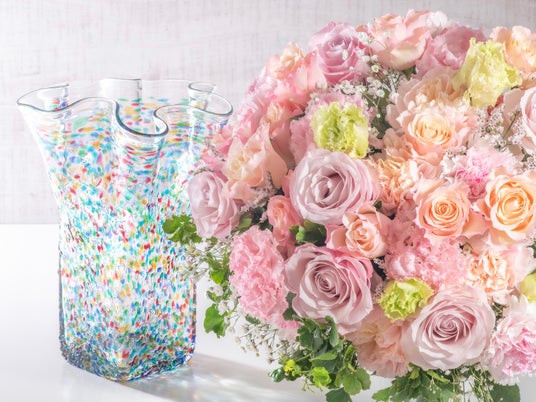 津軽びいどろ「天開 フリル花器(大)ねぶた」と花束のセット イメージ