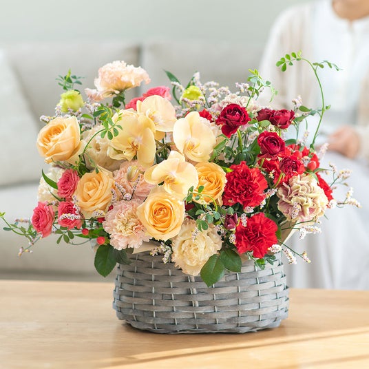 日比谷花壇シニアデザイナー西澤真実子が手掛ける母の日に贈るアレンジメント。MPSを取得し環境負荷低減に取り組む山形県のバラ生産者、熊谷園芸さんの大輪バラを使い、アプリコット色のミディ胡蝶蘭やリシアンサス、赤いカーネーションなどを贅沢に使った華やかで優雅なアレンジメントです。お母さんへ日頃の感謝の気持ちを伝えるのにふさわしい豪華な商品です。