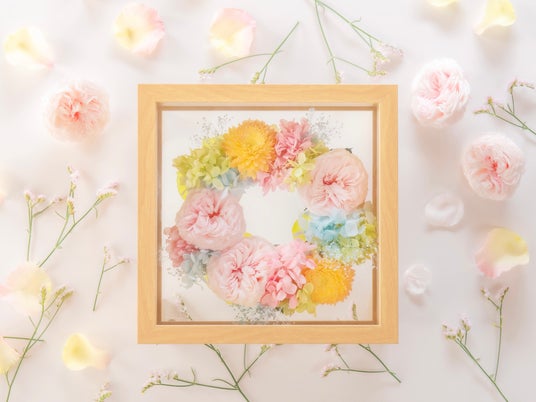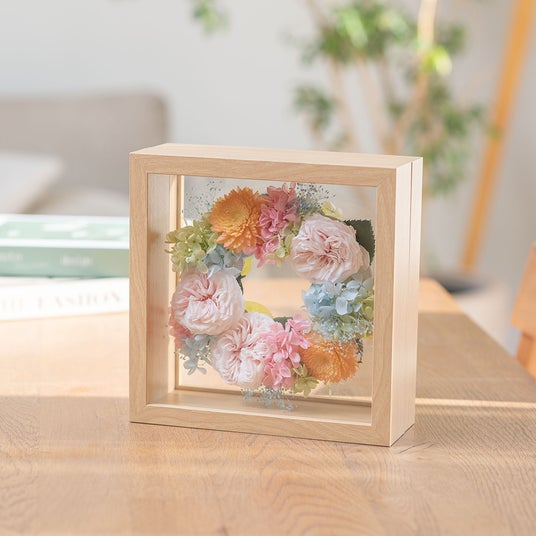 クリアフレームに入った、明るい雰囲気のプリザーブドフラワーリースです。大輪のバラは滋賀県にある國枝バラ園の「ダンスパーティー」を加工したプリザーブドフラワーを使用しています。長くお楽しみいただけるので、思い出の品を大事に取っておきたいお母様へおすすめの商品です。
