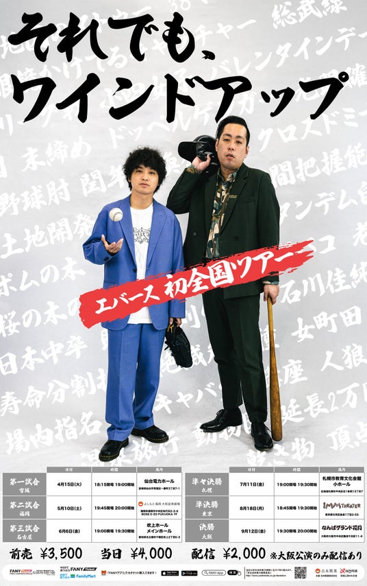 2025年4月15日、佐々木の地元である宮城での凱旋ライブを皮切りに、福岡、名古屋、札幌、東京、大阪の全国6か所にて開催します。昨年『令和6年度 NHK新人お笑い大賞』優勝、『M-1グランプリ2024』決勝進出を果たし、今最も勢いのある若手漫才師。M-1優勝という目標を掲げ、さらに漫才に磨きをかけたエバースがフルスイングでネタをお届けします。また大阪公演限定でオンライン配信もございますので、会場にお越しになれない方も配信にてお楽しみいただけます。