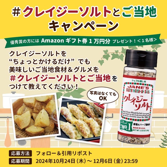 ・目的:1960年代のアメリカで生まれた『クレイジーソルト』は、今では万能調味料として人気ですが、知る人ぞ知る日本のご当地の味にも合う美味しい食べ方を再発見し、ファンの皆さまと共有したいという想いから『クレイジーソルト』公式X(@krazysalt_JP)にて募集キャンペーンを行いました。