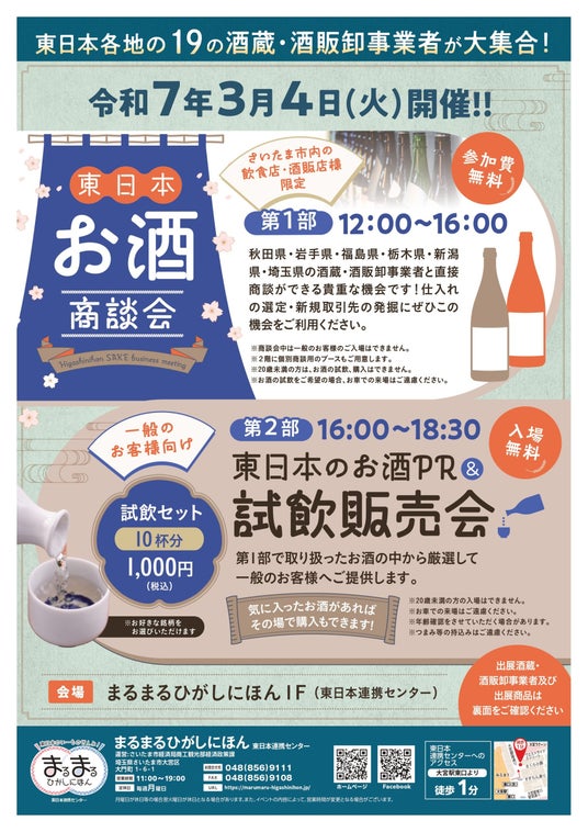 東日本の「ヒト・モノ・情報」が大宮に集合!大宮駅東口から徒歩1分のところにある、交流・発信・活性化を促す地方創生の場「まるまるひがしにほん(東日本連携センター)」で、3月4日(火)に「東日本のお酒商談会&PR試飲販売会」を開催します!