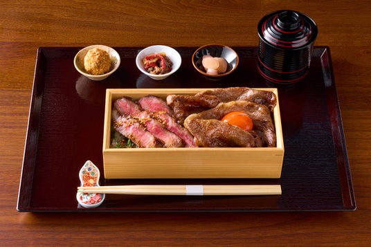 【寛閑観】(滋賀県近江八幡市)近江牛の関西風すき焼き&ステーキ重 こだわり卵のせ(1人前)4,400円