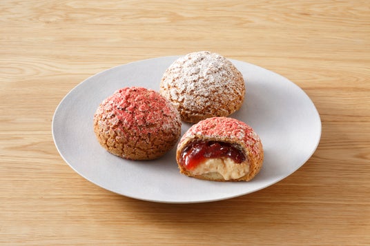 金箔といちごパウダーを散らしたクッキーシューの中に、武笠農園で栽培されたいちごを使った自家製のセミドライいちごとバラジャムをたっぷりと。ふわっと春の香りが感じられるシュークリームです。
