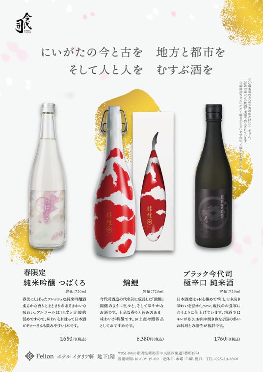1767年創業、新潟清酒の代名詞でもある今代司酒造の美味しい、そして美しい日本酒の中から特におすすめしたい、今代司酒造の代名詞【錦鯉】、春におすすめ【春限定 純米吟醸 つばくろ】、まさに通好み【ブラック今代司 極辛口 純米酒】の三銘酒を集めました。