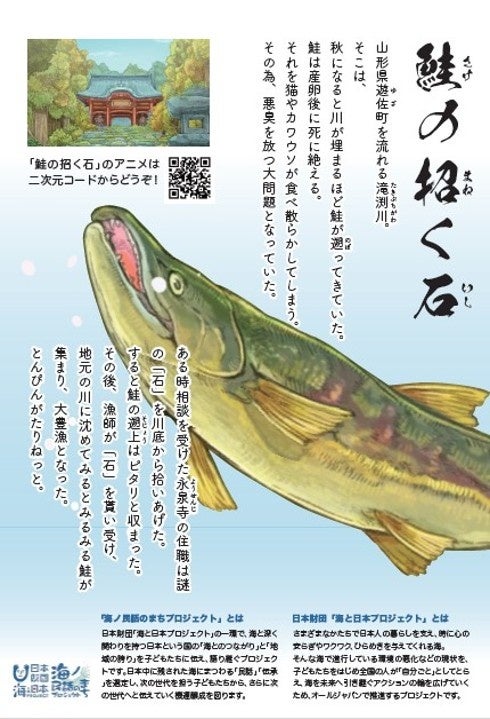 一般社団法人日本昔ばなし協会と日本財団が取り組む「海ノ民話のまちプロジェクト」では、山形県遊佐町に伝わる民話「鮭の招く石」のコラボレーションとして、山形県遊佐町で主に木のおもちゃを制作販売しているM木工と連携し、オリジナル「手ぬぐい」を2025年3月1日(土)から発売開始いたしました。