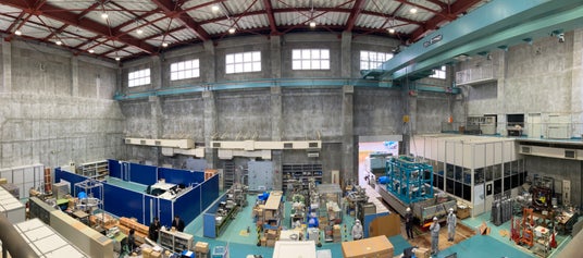 「GALOP」は、茨城県高萩市の助川電気工業からトラックで運ばれ、Helical Fusionスペース(左後方、青色のパーティション)にクレーンで搬入された。
