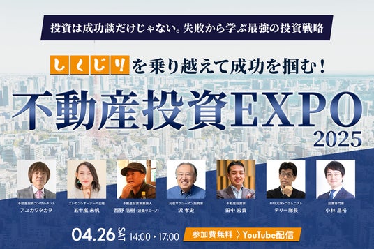 毎回大好評の不動産投資EXPOがついに2025年4月26日(土)第3弾開催決定!今回はさらにパワーアップし、豪華ゲストの現役投資家によるリアルな失敗談を解説。投資で避けるべき落とし穴やリスク回避術を学べる内容です。初心者向けに不動産投資の基礎から実践的なノウハウまで、ここでしか聞けない「価値ある失敗談」をシェアし、成功へ導く戦略が身に付く戦略をお届けします!