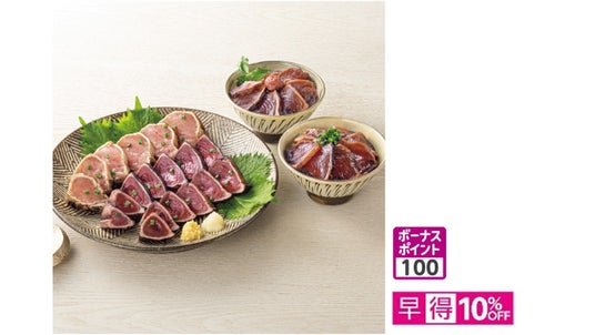藁焼き鰹たたき2(計200g)、びんちょう鮪たたき100g、鰹の湯かけ(梅入り)60g、漁師のわら焼きかつお丼70g×2、たれ20ml×4、おろしにんにく5g・おろししょうが8g 各3