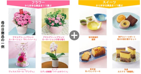 定番のお花にプラスワンで美味しいスイーツを贈り、「おうちでゆっくりとリラックスできる時間を過ごしてほしい」という方も増えていることから、花とスイーツをそれぞれ好みに合わせて選べる商品や、お花とスイーツのセット商品を強化し、80品目展開します。そのほか、有名パティスリーや話題のブランドなど特別感あふれる本格スイーツや、ごちそうグルメなど、一緒に家族で食卓を囲んでお母さん・お父さんを労うシーンにぴったりの商品も豊富に取り揃えます。