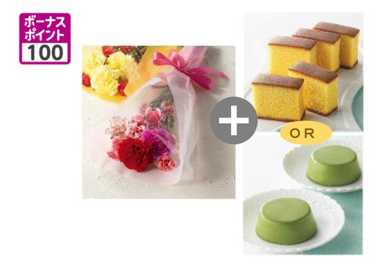 大輪の花と可憐なスプレー、2種のカーネーションを合わせた花束に、職人が手焼きで仕上げる長崎カステラか、嬉野茶玉露の風味が豊かに広がるショコラプリンを組合わせて贈れます。