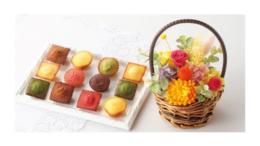フィナンシェやマドレーヌと、カゴいっぱいのバラや千日紅のプリザーブドフラワーのセットです。