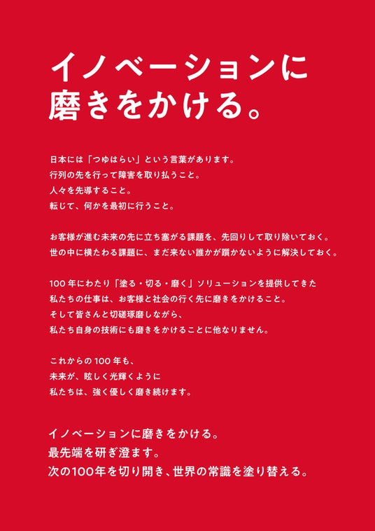 我々は1925年の創業以来、メーカーとして培ってきた当社のコア技術である「塗る・切る・磨く」と共に発展してまいりました。この「塗る・切る・磨く」を通して、世界の変化を支えることが、我々が果たすべき役割であり存在意義であります。