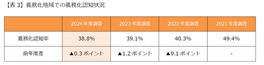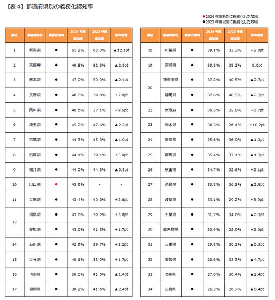 (注3)2024年度は、山口県と石川県と岡山県が義務化しましたが、石川県と岡山県は県庁所在地である金沢市と岡山市が2023年度以前に義務化しているため、本リリースでは2024年度の新たな義務化地域としては扱っていません。