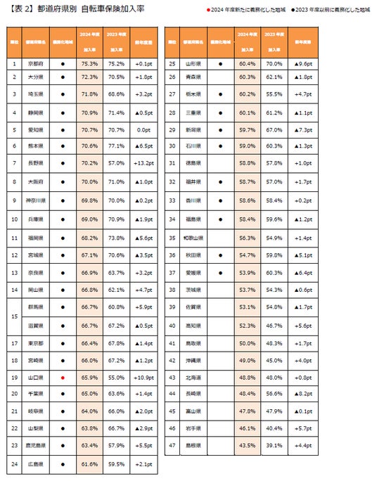 都道府県別では、京都府の加入率75.3%がトップで、国土交通省の数値目標を唯一クリアしています。また、2024年度に新たに自転車保険への加入を義務化した山口県(注3)の加入率は昨年度から10ポイント以上上昇しました。