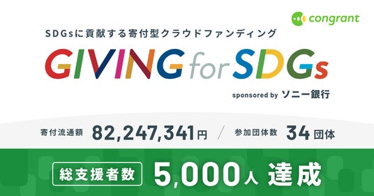 ソーシャルセクターと企業向けに「寄付DXシステム」を提供するコングラント株式会社(本社:大阪市西区、代表取締役:佐藤正隆、以下「コングラント」)は、ソニー銀行株式会社(代表取締役社長:南 啓二/本社:東京都千代田区)の協賛で運営するSDGsを推進するNPOのクラウドファンディングを支援するプログラム「GIVING for SDGs」にて、総支援者数5,000人を突破したことをお知らせします。