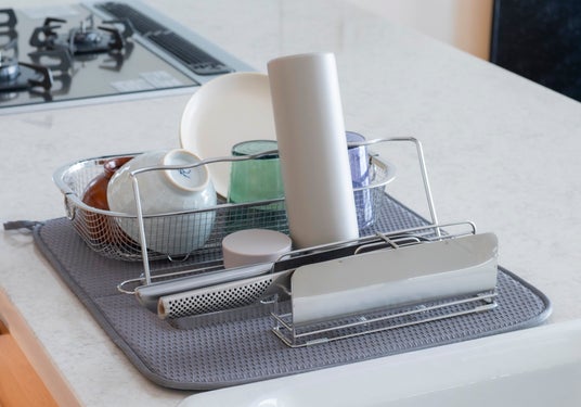 当製品は、同シリーズから発売されている「すっきり暮らす水切りマット」の上でもお使いいただけます。さらに、同シリーズの水切りかごやジャグボトルスタンドなどと組み合わせてお使いいただいても、水切りマットにピッタリ収まり、見た目もすっきり。