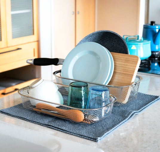 一緒に吸水タオルを使うことを推奨しています。かごのおかげで、お皿を重ねても滑らずに、立たせて水切りが可能に。