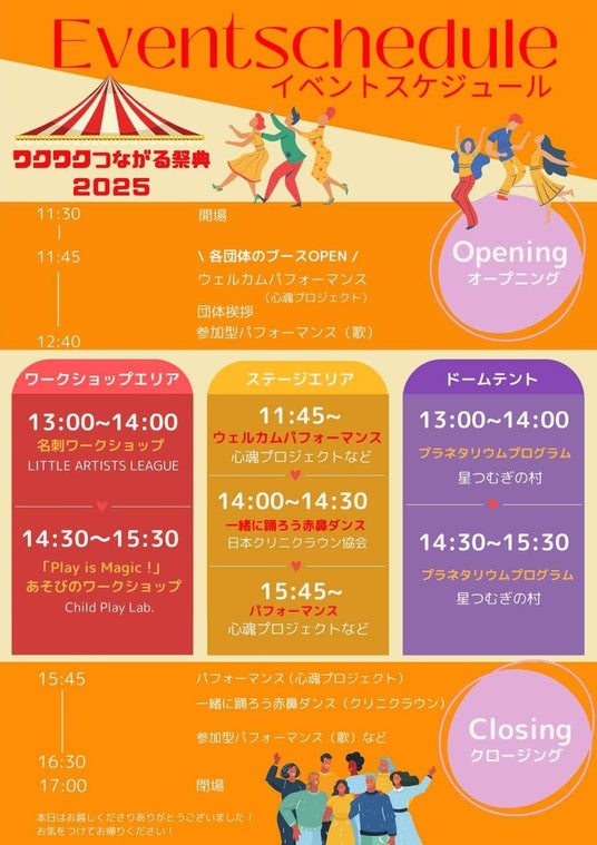 会場では病院・施設でしか会えないクリニクラウンと一緒に遊ぶことができたり、ブース展示・出張遊び場の他、名刺ワークショップや遊びのワークショップ、7mドームでのプラネタリウムプログラム、本格的な歌や踊りのパフォーマンスなど様々なイベントもお楽しみいただけます。
