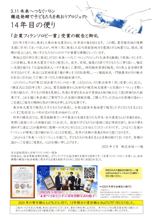 ふるさとを思い自然との共生を事業の核に据えた酒造りを営む同社は、2011年の東日本大震災時、「沿岸部の子どもたちは勉強どころではない」との社員の一言を契機に全社員で被災地を視察。子どもたちに学ぶ機会と場所を提供したいという思いから、支援活動を検討。2011年当時0歳だった子どもが20歳を迎える2031年までバトンをつなぎ続けるとの決意のもと、宮城県産米を使用した原酒『3.11未来へつなぐバトン』を製造・販売し、売上全額を公益社団法人ハタチ基金に寄付する取り組みを同年12月に立ち上げた。2023年度までの寄付額は累計約8,000万円にのぼる。