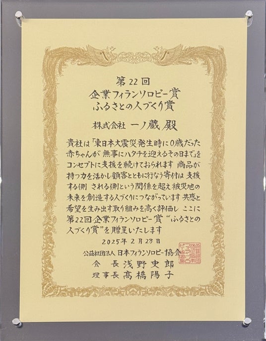 「第22回 企業フィランソロピー大賞」において、株式会社一ノ蔵(宮城県大崎市松山 代表取締役社長 鈴木 整)は、~東日本大震災復興支援プロジェクト~未来へつなぐバトン醸造発酵で子どもたちを救おうプロジェクト「一ノ蔵特別純米原酒3.11未来へつなぐバトン」の取り組みで「企業フィランソロピー賞・ふるさとの人づくり賞」を受賞しました。