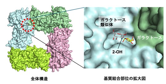 図2. β-1,2-ガラクトオリゴ糖に作用するβ-ガラクトシダーゼの構造 右図ではガラクトース類似体の2位ヒドロキシ基が結合するガラクトースの方向を向いており、この酵素がβ-1,2-結合に作用できることが構造的に示されている。