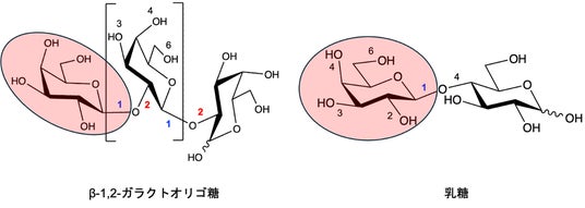 図1. β-1,2-ガラクトオリゴ糖と乳糖の模式図 ヒドロキシ基にはその番号を記載している。β-1,2-ガラクトオリゴ糖ではガラクトースの1位と2位のヒドロキシ基どうしで結合しており、β-1,2-結合となっている。乳糖はガラクトースとグルコースがβ-1,2-結合で連なっている。β-ガラクトシダーゼは赤で囲ったガラクトース部分を分解する酵素である。