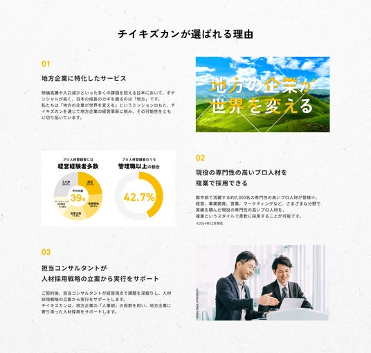 - 地方企業の実態に寄り添った採用支援:地方企業の経営課題に応じた採用戦略から、複業人材の活用までトータルサポート。