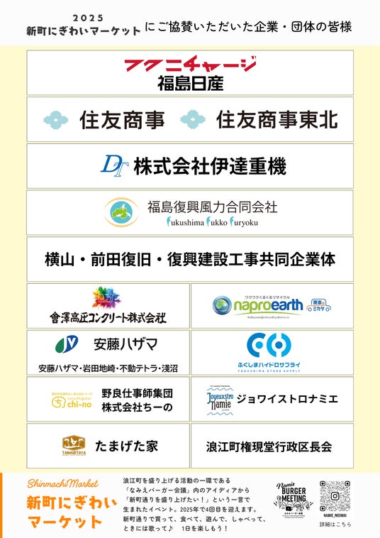福島日産自動車株式会社 / 住友商事株式会社 / 住友商事東北株式会社 / 株式会社伊達重機 / 福島復興風力合同会社 / 横山・前田復旧・復興建設工事共同企業体 / 會澤高圧コンクリート株式会社 / 株式会社ナプロアース / 安藤ハザマ・岩田地崎・不動テトラ・淺沼 /ふくしまハイドロサプライ株式会社 / 野良仕事師集団 株式会社ちーの / ジョワイストロナミエ / たまげた家 / 浪江町権現堂行政区長会