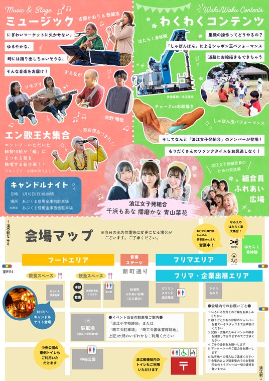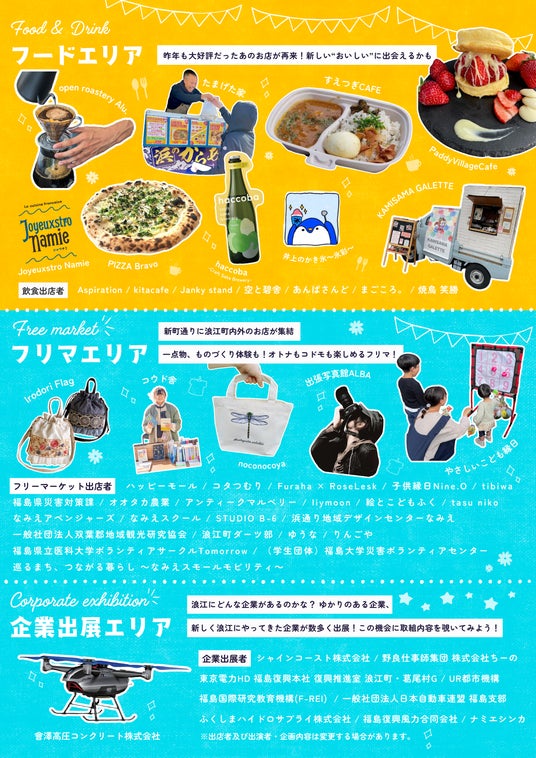 当日は、フリーマーケットエリア・フードエリアでは浪江町内外から人気のお店が集結します。また、町の復興に尽力する地元企業や新規進出企業が取り組みを紹介するブースを出展します。音楽ステージや体験コンテンツなど、大人から子どもまで楽しめる「わくわく体験」も充実させています。