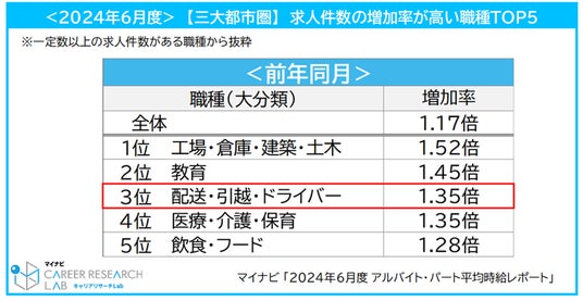 職種(大分類)別では、[配送・引越・ドライバー]が1,249円(前月比35円増、前年同月比104円増)で、調査開始以来最高額となった。また、求人件数も前年同月比で1.31倍となり、「働き方改革関連法」、いわゆる「2024年問題」の影響も推察される。