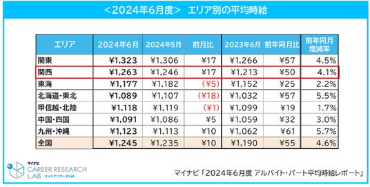 「関西」の平均時給は1,263円で、3カ月連続で増加