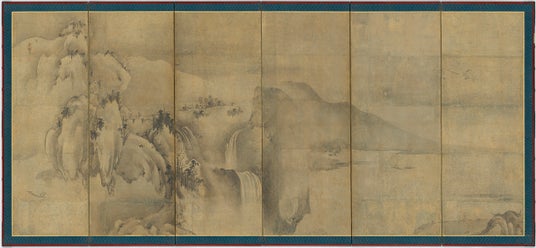 雪村の晩年を代表する貴重な作品で、六曲一双(ろくきょくいっそう)※の中央部に湖水の広がりを置き、左右に湖岸の山と建物を配する構図となっています。