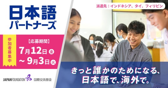 独立行政法人国際交流基金(The Japan Foundation,JF)は、アジアの中等教育機関等で現地の日本語教師と学習者のパートナーとして、日本語教育を支援する日本語パートナーズ派遣事業を実施しています。2025年にインドネシア、タイ、フィリピンに派遣する日本語パートナーズの募集を2024年7月12日(金)から開始しました。株式会社ポニーキャニオンは、今年度の派遣募集広報を担当し、各種イベントのプロデュース等を行っています。