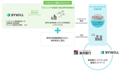 本協定をもとに、バイウィルは西会津町森林組合が管理する森林からのJ-クレジット(*3)創出について申請手続きを受託・代行し、販売先については東邦銀行と協力して探索します。