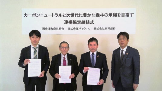 日本全国47都道府県のカーボンニュートラル実現を目指す株式会社バイウィル(本社:東京都中央区、代表取締役社長:下村 雄一郎、以下「バイウィル」)は、福島県西会津町森林組合(*1:福島県耶麻郡西会津町、代表理事組合長 清野 邦夫、以下「西会津町森林組合」)、株式会社東邦銀行(*2:福島県福島市大町、取締役頭取 佐藤 稔、以下「東邦銀行」)と、「カーボンニュートラルと次世代に豊かな森林の承継を目指す連携協定」を締結しました。