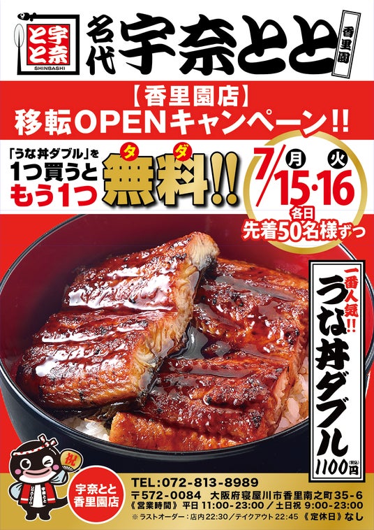 1年で1番鰻を食べたくなる日…土用の丑の日まで、もう間もなくというタイミングで、「名代 宇奈とと 香里園店」が、より駅近の商店街に移転。仕事帰りやショッピングの途中などでご利用いただきやすくなりました!