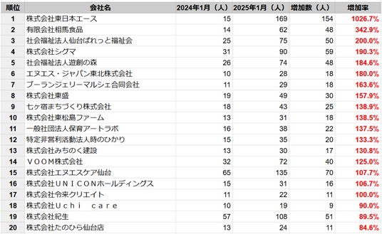 「誰もが活躍できる仕組みをつくる。」をミッションに掲げ、セールスチームの武器となるデータベース「SalesNow」を展開する株式会社SalesNow(本社:東京都渋谷区、代表取締役:村岡功規、以下「SalesNow」)は、国内550万社の企業情報を完全網羅した日本最大級のデータベース「SalesNow DB」より、宮城県に本社を置く企業の2024年1月時点および2025年1月時点の従業員数データを分析し、従業員数増加率ランキングTOP20を発表しました。本ランキングは、各企業の成長スピードを可視化するものであり、新規雇用の創出や事業拡大の動向を明らかにしています。