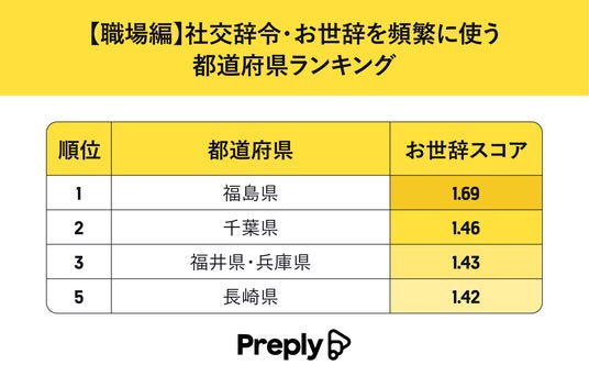 講師とマンツーマンで学習ができるオンライン語学学習プラットフォームを提供するPreply(本社:アメリカ、CEO:Kirill Bigai)は、全47都道府県、20~59歳の計4,700名を対象にした、「お世辞・社交辞令をもっとも使う都道府県についての調査」の結果を発表しました。