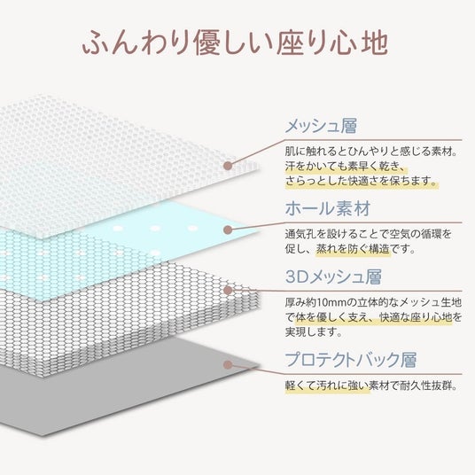 2. ふんわり優しい座り心地4層3Dメッシュ生地で、厚さがあってふんわりとした座り心地を実現しました。ひんやりした、通気性のあるメッシュ生地で、敏感な赤ちゃんの肌への刺激を最小限にします。