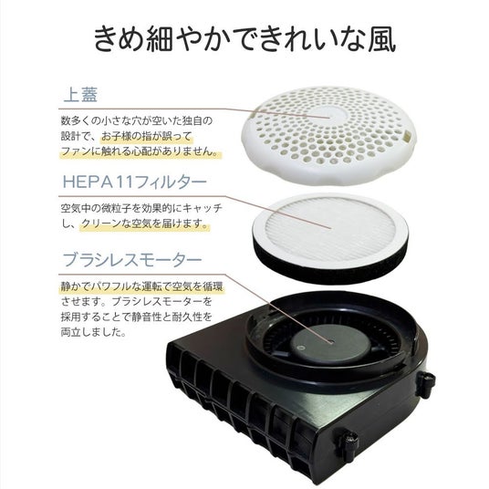 創業約30年の家電開発ノウハウを活かした送風ファンは、花粉やホコリなどをキャッチする高性能フィルターと、静音性・耐久性に優れたブラシレスモーターを搭載しています。33個の空気孔から優しい風を送り、赤ちゃんの頭から足元までサラサラ快適な環境を提供します。