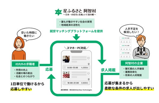 株式会社Matchbox Technologies(マッチボックステクノロジーズ 本社:新潟県新潟市中央区、代表取締役社長:佐藤 洋彰)は1回・数時間単位の求人と働き手をオンラインでマッチングする自治体公式のスポットワークプラットフォームの構築・運用をサポートしています。この度、長野県阿智村(村長:熊谷 秀樹 くまがい ひでき)はマッチボックステクノロジーズと「阿智村求職求人マッチングシステム導入業務委託」を8月1日(木)より開始いたします。本事業により長野県阿智村は公式のスポットワークプラットフォーム「阿智村マッチボックス」(URL:https://matchbox.jp/nagano/achimura 8月1日オープン予定)の開設とアプリケーションの提供を行います。それに先駆けて、7月12日(金)より、「阿智村マッチボックス」事業者登録専用サイト(URL:https://matchbox.jp/nagano/achimura/dx-project )をオープンしました。利用企業は長野県阿智村を就業地とした求人を掲載でき、求人は「阿智村マッチボックス」のwebサイトおよびアプリケーション上に集約され、全国から閲覧・応募することができるようになります。