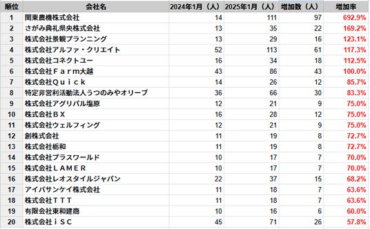 (※増加率=(2025年従業員数 - 2024年従業員数) ÷ 2024年従業員数 × 100)